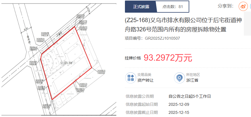12月9日,義烏市排水有限公司位于后宅街道神舟路326號(hào)范圍內(nèi)所有的房屋拆除物處置信息公布,掛牌價(jià)格93.2972萬元。