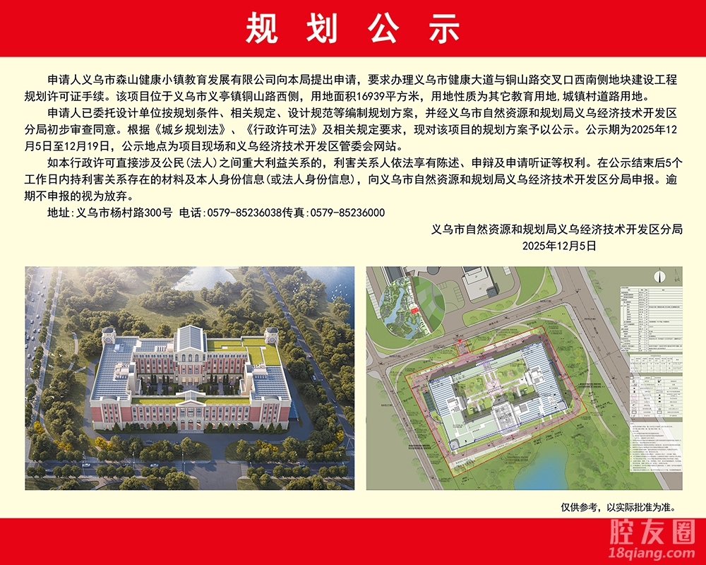 12月5日,健康大道與銅山路交叉口西南側(cè)地塊規(guī)劃方案公示。 申請(qǐng)人義烏市森山健康小鎮(zhèn)教育發(fā)展有限公司向本局提出申請(qǐng),要求辦理義烏市健康大道與銅山路交叉口西南側(cè)地塊建設(shè)工程規(guī)劃許可證手續(xù)。 申請(qǐng)人已委托設(shè)計(jì)單位按規(guī)劃條件、相關(guān)規(guī)定、設(shè)計(jì)規(guī)范等編制規(guī)劃方案,并經(jīng)義烏市自然資源和規(guī)劃局義烏經(jīng)濟(jì)技術(shù)開(kāi)發(fā)區(qū)分局初步審查同意。根據(jù)《城鄉(xiāng)規(guī)劃法》、《行政許可法》及相關(guān)規(guī)定要求,現(xiàn)對(duì)該項(xiàng)目的規(guī)劃方案予以公示。 公示期為2025年12月5日至12月19日,公示地點(diǎn)為項(xiàng)目現(xiàn)場(chǎng)和義烏經(jīng)濟(jì)技術(shù)開(kāi)發(fā)區(qū)管委會(huì)網(wǎng)站。