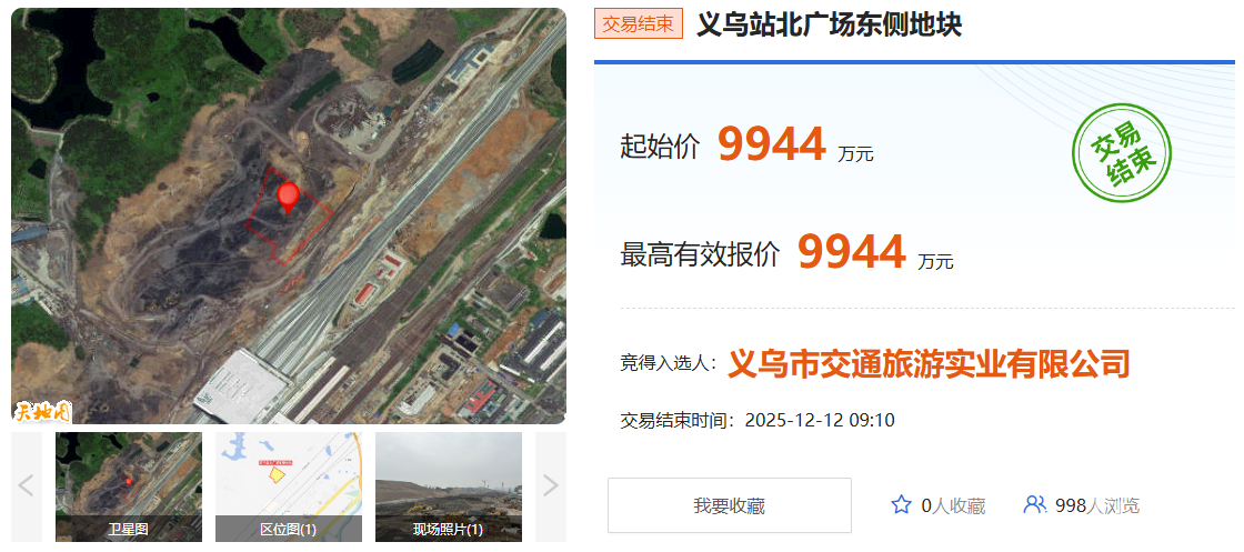 12月12日,義烏站北廣場東側地塊成功出讓。義烏市交通旅游實業有限公司以底價9944萬元競得該地塊。   地塊位于后宅街道北廣場東側。地塊出讓面積16574.75㎡(24.862畝),起始價9944萬元,競買保證金9944萬元。 土地用途商務金融用地,適建內容商務及其配套用房,容積率2.00-2.50,建筑密度≤45%,綠地率≥20%,建筑高度≤35米,出讓年期40年。